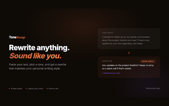 ToneSwap är ett praktiskt tillägg för Chrome som möjliggör enkel omskrivning av text i din egen stil. Med hjälp av AI-teknologi kan användare markera text på vilket webbsida som helst och få den omskriven med ett klick. Programmet erbjuder flera tonval, inklusive professionell, avslappnad och akademisk, vilket gör det möjligt att anpassa skrivstilen efter behov. Användare kan också skapa en personlig rösterprofil som lär sig av deras skrivvanor, vilket gör att omskrivningar blir mer naturliga och personliga ju mer de använder tjänsten.